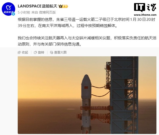 IT之家1月31日消息,蓝箭航天今日发文称,根据目前掌握的信息,朱雀三号遥一运载火箭二子级已于北京时间1月30日20时39分左右,在南太平洋海域再入,过程中按预期烧蚀解体。